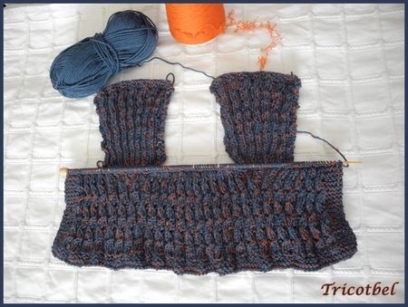 J'ai utlisé une laine foncée que j'ai éclairée avec un fil trrrrès fin orange.